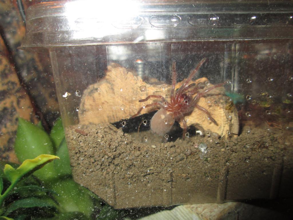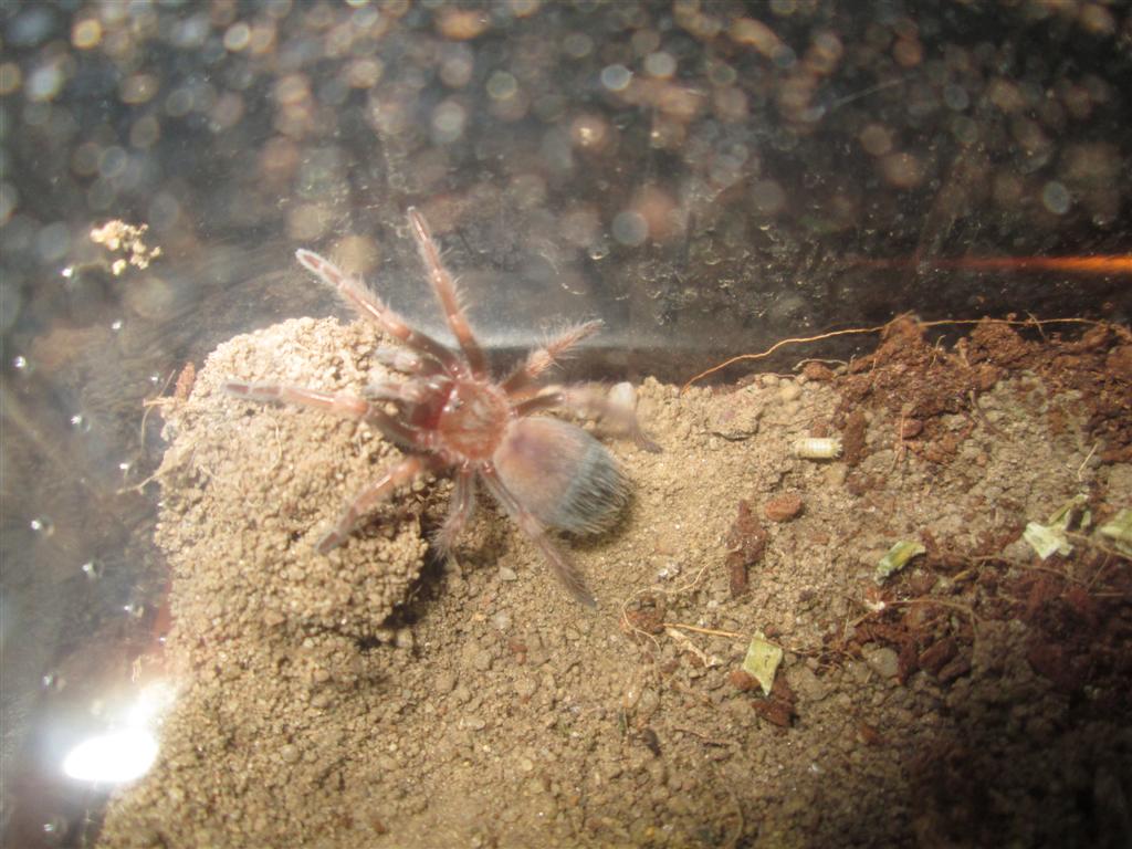 Bisher war der Fussel beim fressen ja eher bedächtig. Vor 10 Tagen hat sie dann 2 mittlere Heimchen auf einmal vernascht und vor 7 Tagen konnte ich zusehen wie sie den Höhleneingang von innen zugeschaufelt hat. Bin mal gespannt wie groß sie ist wenn sie sich wieder ausbuddelt.