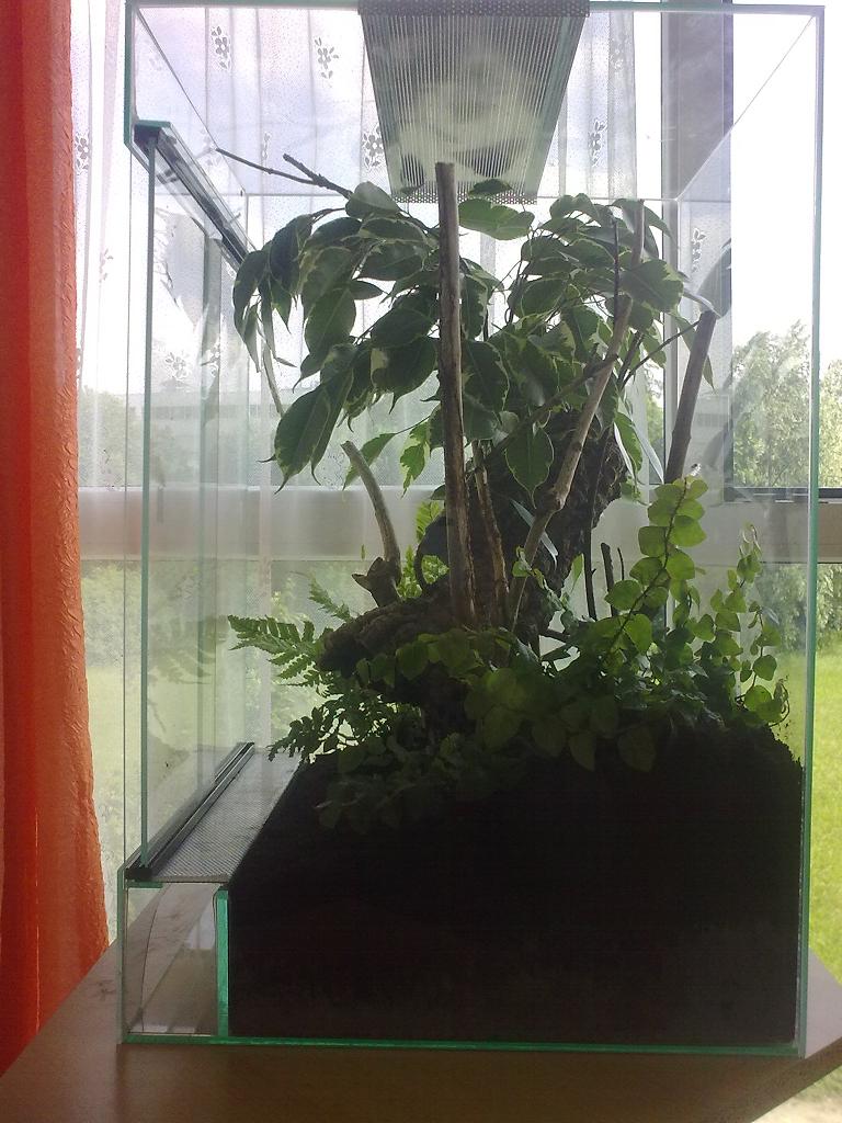 sieht aber sehr schön aus! Und ich sehe keinen Grund warum die Pflanzen nicht halten sollten. Die werden Dir im Gegenteil schön das Terrarium zuwuchern. Bin mal gespannt ob der Mieter dann die (sauteure) Korkröhre auch annimmt. Meine Versi baut ihr Gespinst lieber selbst zwischen die vorhandenen Blätter und ignoriert die (2€)-Korkröhre.