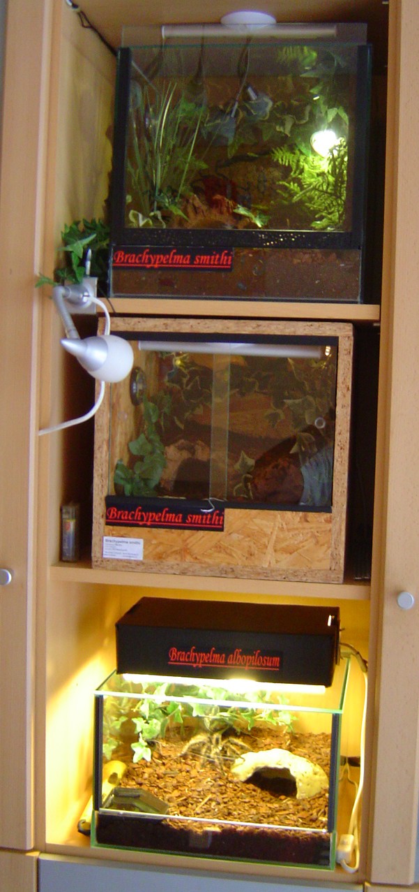 Hallo Spiderman,ja das Terra ist selber gebaut.Ich beleuchte meine Becken von aussen.Im Terra ( oben ) ist eine LED Leuchte die macht nicht warm und wird mit Batterien betrieben.Genauso die Birnchen,die man in der Decke sieht.Die wird auch mir Batterien betrieben,ist die Beleuchtung für Abends.