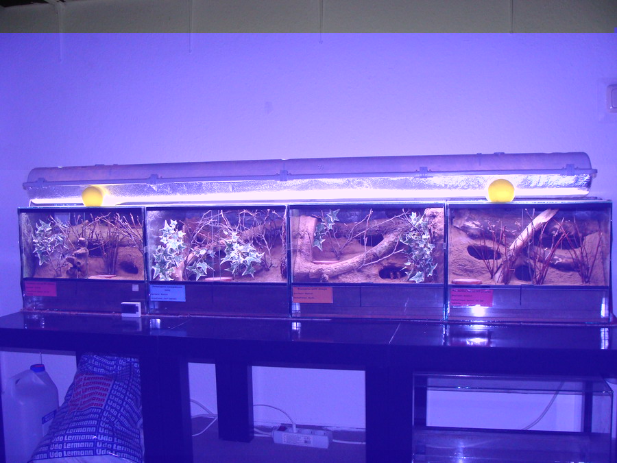 Nur nicht den mut verlieren. Was ich da hin bekommen hab, kann man mit etwas übung auch. Ich hab ebenfalls sehr lange gebraucht um solche Terrarien hin zu bekommen. Wenn ich mir meine alten Einrichtungen alle anschau kommt mir das grausen :) , obwohl die Terrarien damals schon für gut befunden wurden. Das meine Erde so hell ist liegt bestimmt an der Leuchtstoffröhre und dem trockenen Bodengrund. Die Vollspektrum Leuchtstoffröhre ist ne 59 Watt Biolicht. Farbtemperatur ist 5800k. Farbwiedergabeindex liegt bei der Röhre bei 96. Je näher der Wert an die 100er Marke rankommt, umso Tageslichtähnlicher wirkt die Lampe. Der Farbwiedergabewert bei meiner Röhre is also schon Op-Licht, so hell is die :) .
