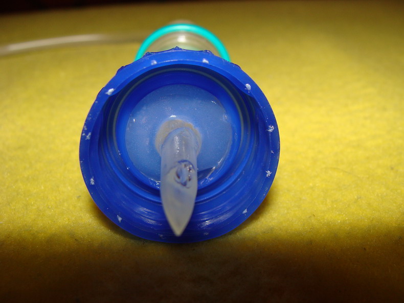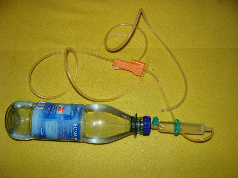 Man braucht ne 0,5 Liter Wasserflasche, ein Infusionsbesteck (aus der Apotheke), etwas Heißkleber. Zuerst bearbeitet man die Wasserflasche. Dazu bohrt man mittig in den Schraubverschluß der Flasche mit einem 4mm Bohrer ein Loch, steckt den Anstechdorn des Infusionsbestecks durch und versiegelt das ganze von der innenseite des Verschlußes mit Heißkleber. Da muß man aufpassen das man nicht zuviel nimmt sonst passt der Deckel nicht mehr drauf. Wenn das versiegelt ist, ist die selbstgebaute Tropftränke auch schon Einsatzbereit. Ich häng noch Fotos an damit man weiß wie das ganze aussieht