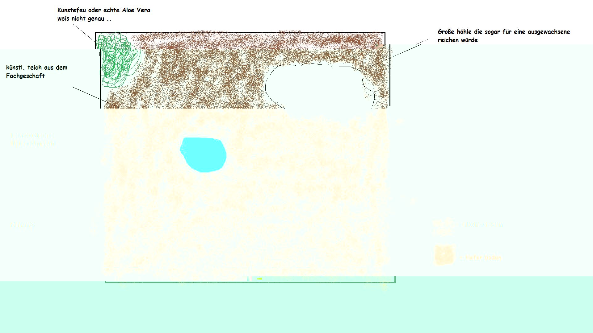 Wenn es eine echte Pflanze sein soll, dann würde ich die in die Nähe des Wassernapfes stellen, so kriegt sie in dem eher zu trockenen Habitat zumindest etwas Wasser (überlaufen lassen). Aber rechne damit, dass Deine Smithi Pflanzen evtl. nicht mag (so wie meine)...