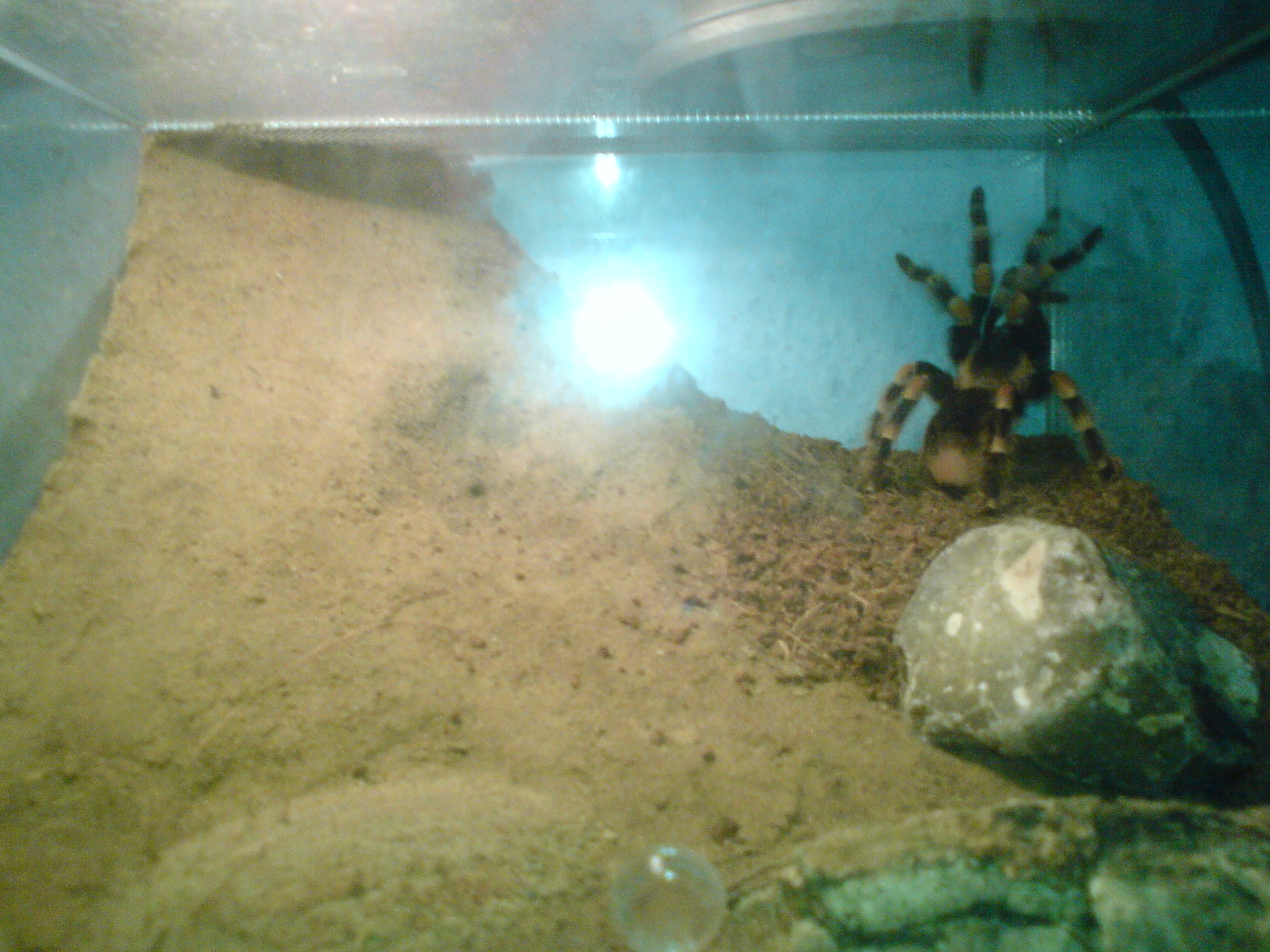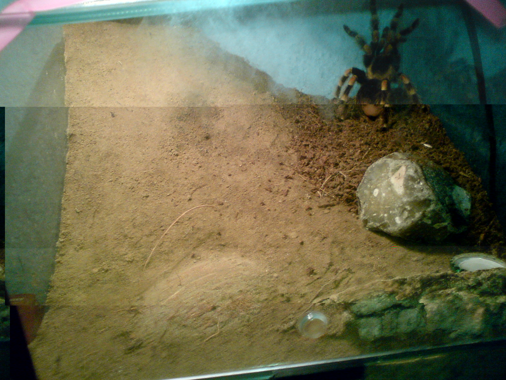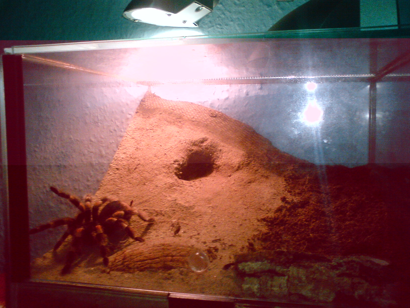 Ich sehe da nur keine Versteckmöglichkeiten für die Spinne :( . Du könntest in dem Erdwall ein Loch einbringen, so dass die Spinne dies ggf. als Höhle annimmt und weiter ausbaut oder ihr alternativ ein Stück Baumrinde oder eine Korkhöhle anbieten. Ansonsten vielleicht noch eine kleine Pflanze (z.B. Efeu) für ein verbessertes Klima, sieht hübsch aus und bietet dem Tier ebenfalls eine Versteckmöglichkeit.