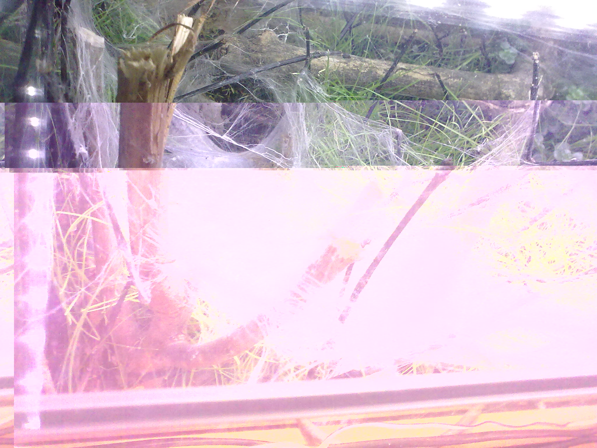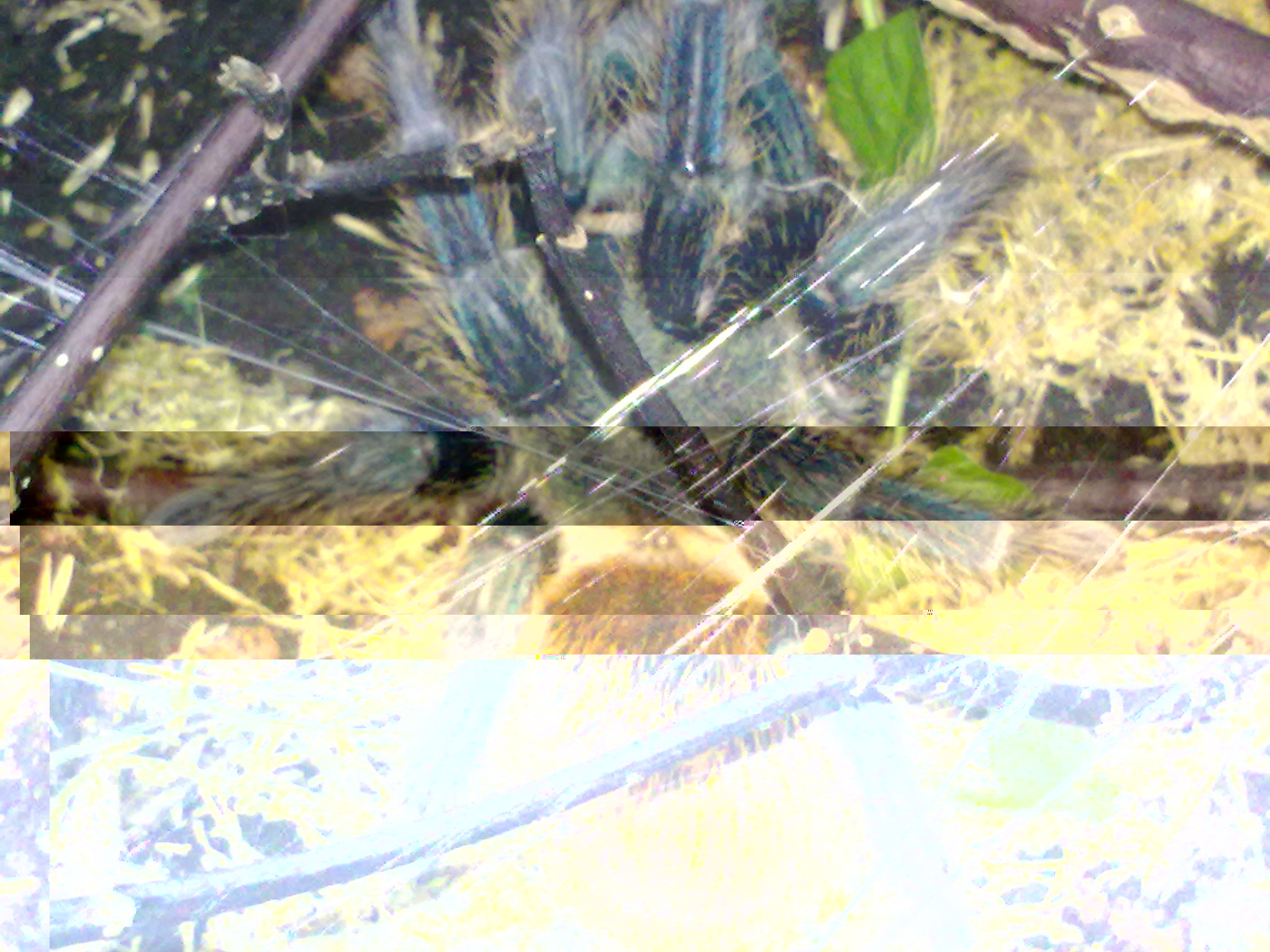 Sie ist letzte Nacht auch schon fleißig drin rumgelatscht, alles voller OrientierungsBalken (mit spärlichen Fädchen gibt sich die Perle der Vogelspinnen ja nicht zufrieden, müssen ja gleich ganze Bahnen gezogen werden).