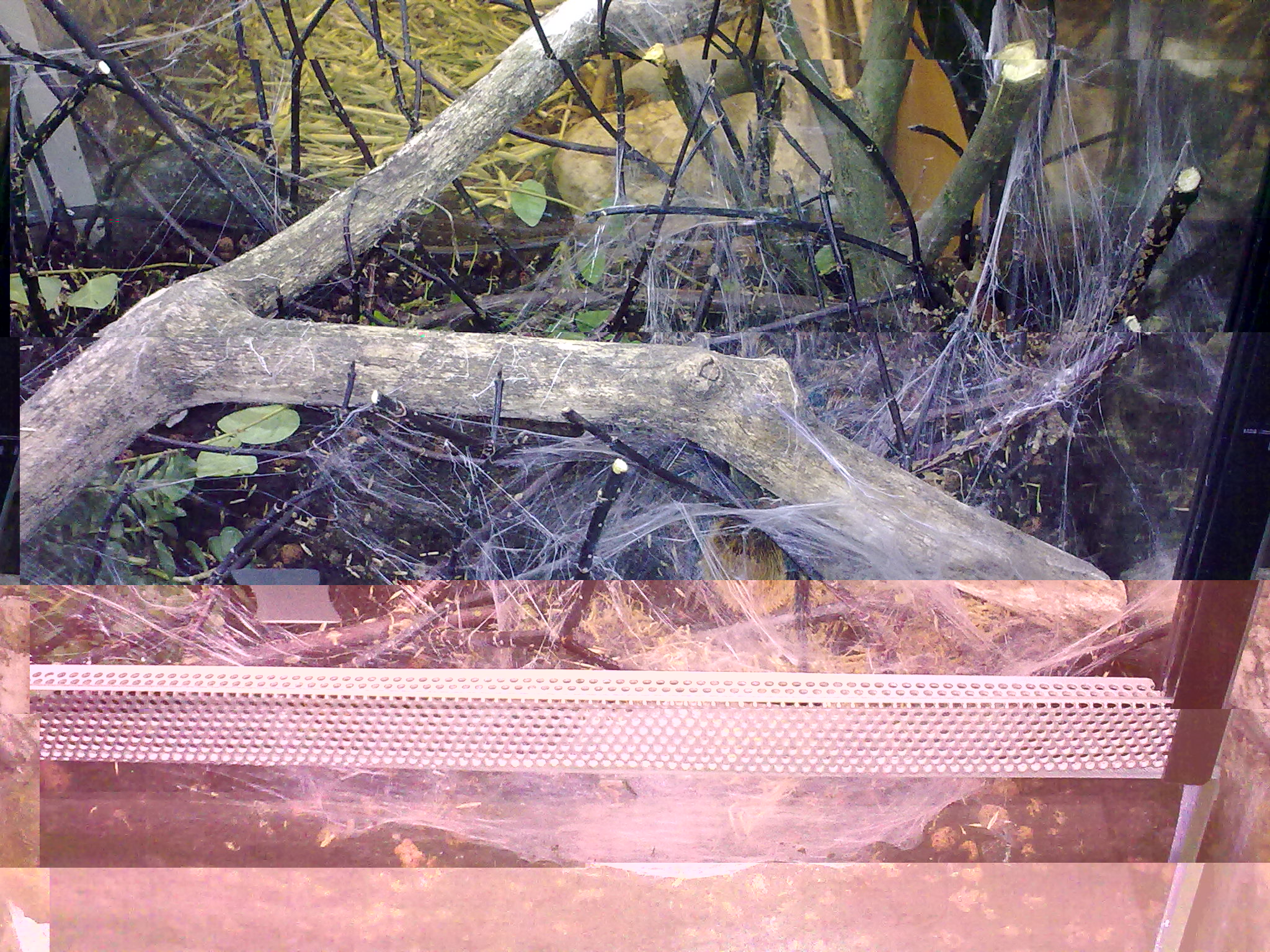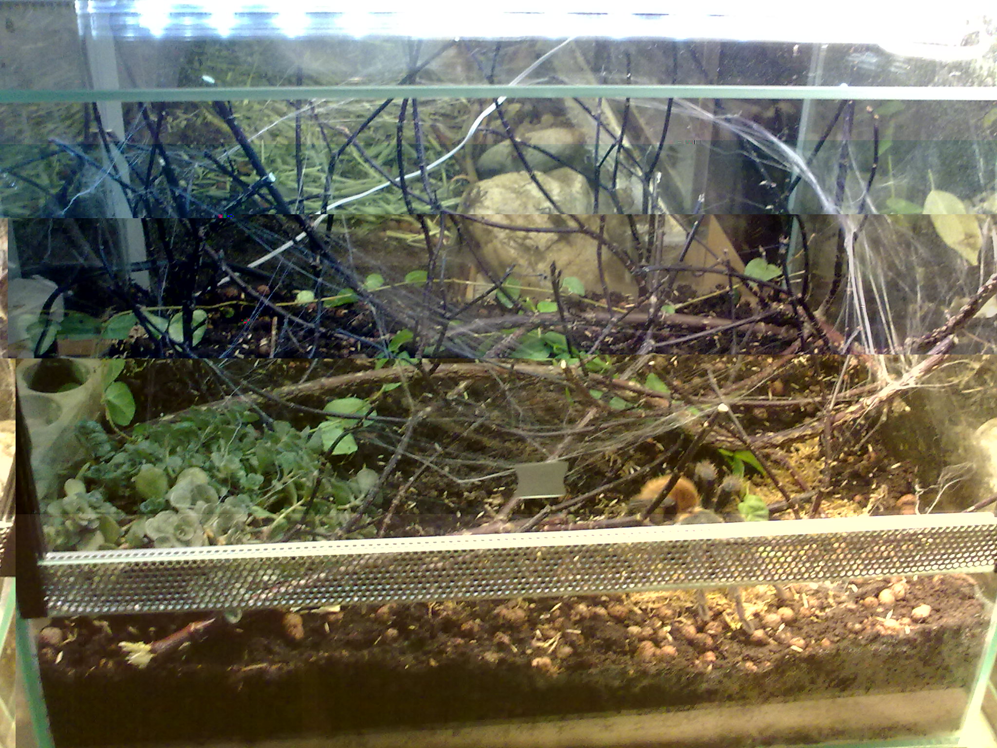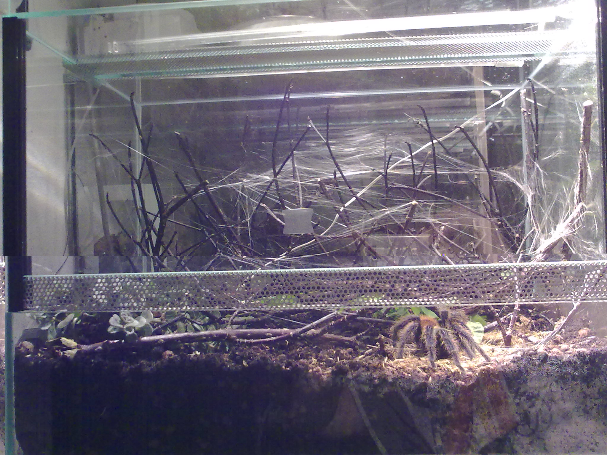 Auf die Kunstpflanzen habe ich verzichtet und lieber eine echte riskiert. Die Erde hab ich vom ersten Terra einfach umgeschaufelt, frisch mit Asseln und Springschwänzen "geimpft" und neue Zweige rein. Interessant, wie geschickt sich so eine doch recht große Spinne, die eigentlich nicht wirklich was sieht, da durchmanövriert.