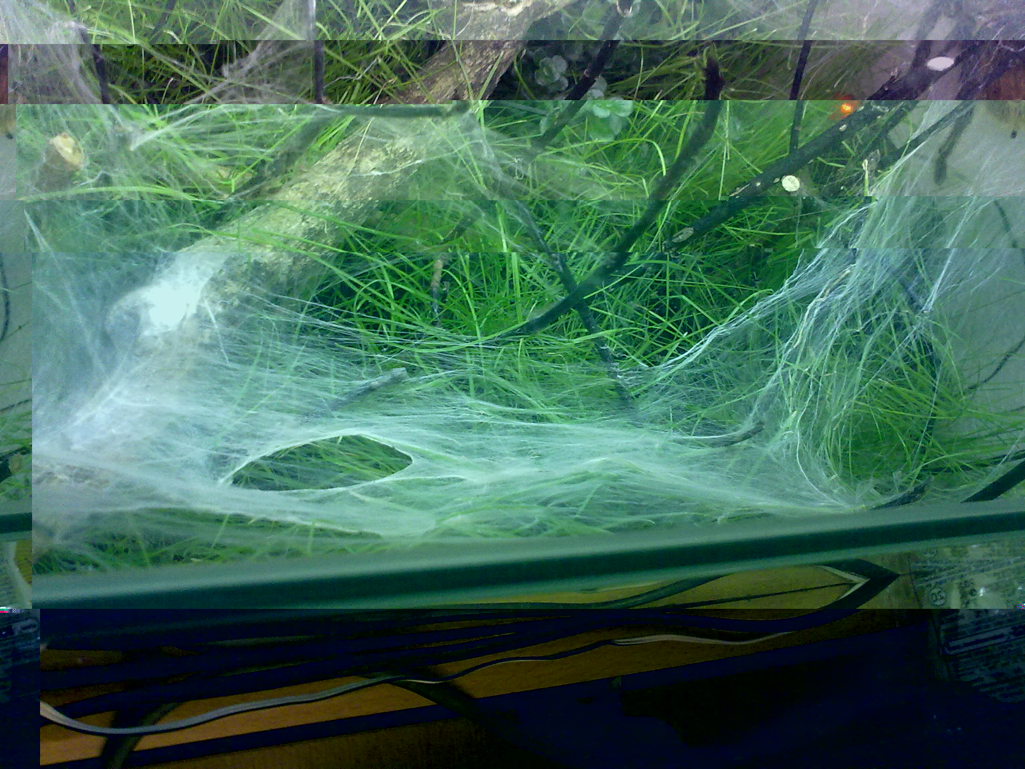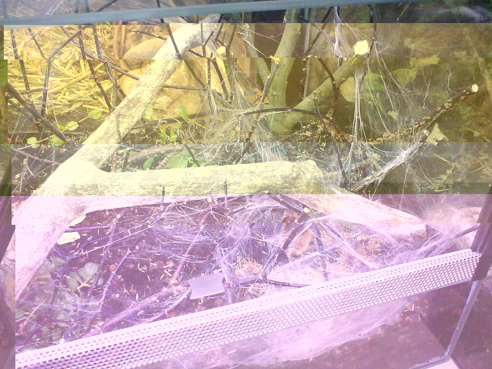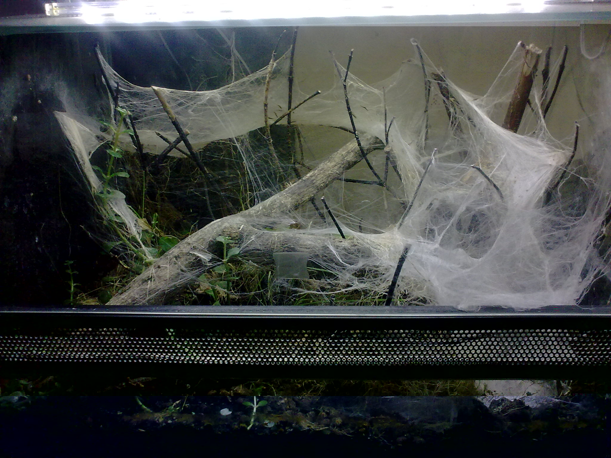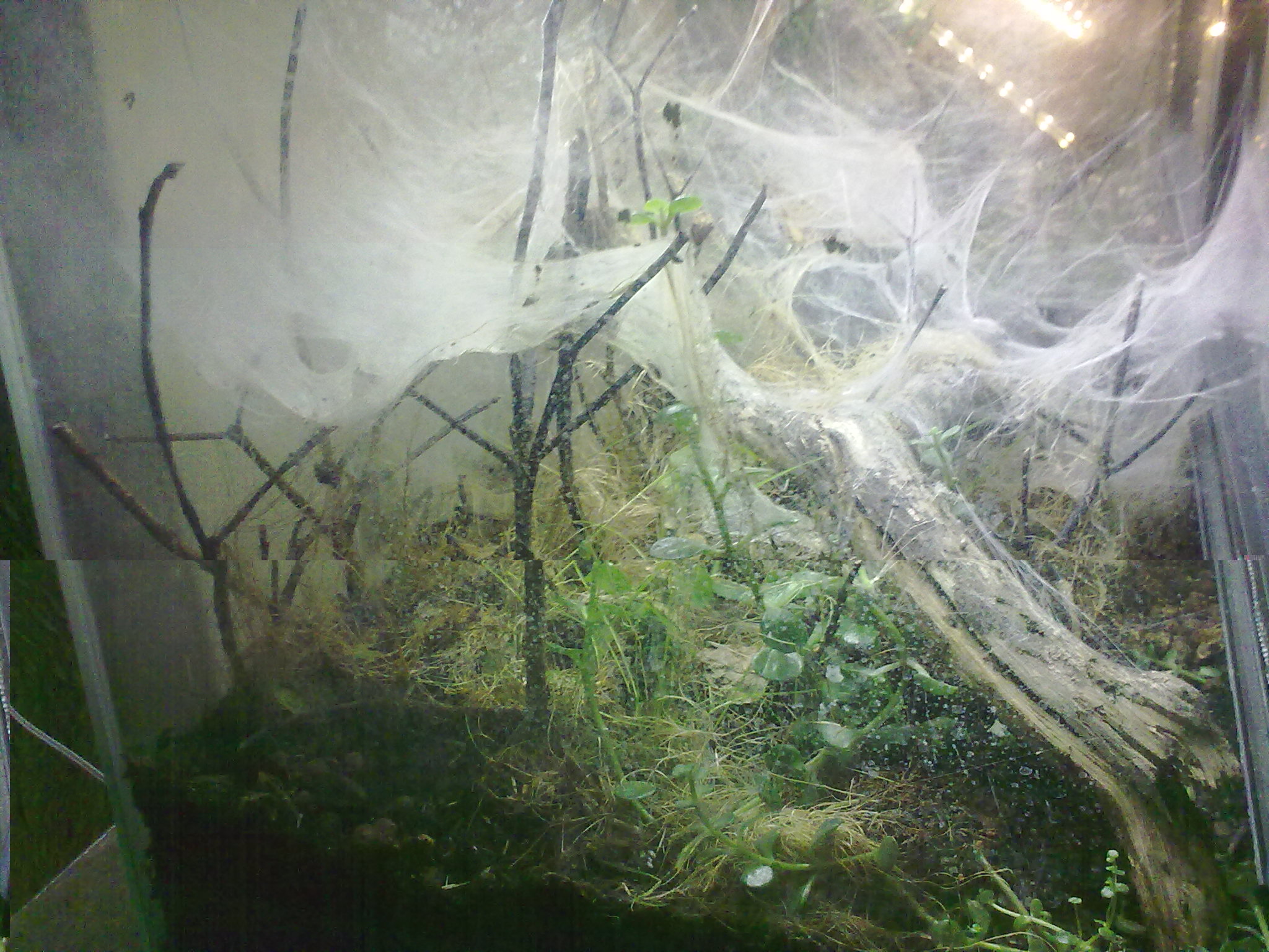 Auf die Kunstpflanzen habe ich verzichtet und lieber eine echte riskiert. Die Erde hab ich vom ersten Terra einfach umgeschaufelt, frisch mit Asseln und Springschwänzen "geimpft" und neue Zweige rein. Interessant, wie geschickt sich so eine doch recht große Spinne, die eigentlich nicht wirklich was sieht, da durchmanövriert.