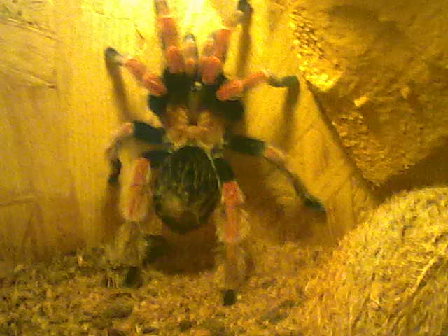 Zur Boehmei gibts nicht viel zu sagen. Die Art ist sehr nervös. Wenn sie gestört wird oder erschreckt wird bombardieren mache Tiere da mal sofort drauf los. Die Art ist ebenfalls sehr zeigefreudig aber wie gesagt auch sehr schreckhaft. Die Häutungschübe sind bei dieser Art auch recht groß. Die Haltungsbedingungen kannst Du von B. smithi übernehmen da beide Arten aus dem gleichen Land kommen. B. boehmei ist aber etwas wählerisch in der auswahl ihrer Wohnröhre. Ich hab 4 Umbauten gebraucht bis die Madame sich dazu überreden lassen hat zu graben. Auch bei dieser Art ist Vorsicht geboten bei der Anschaffung. Die Art sieht der Aphonopelma bicoloratum verdammt ähnlich. Auch hier gibts Merkmale. Die bicoloratum hat keinen schwarzen Augenhügel und das Männchen der Art ist schwarz, bei B. boemhei sind beide Geschlechter gleich gefärbt.