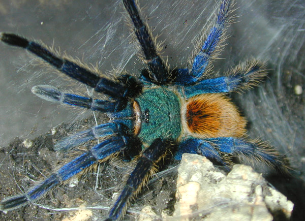 Wie man sieht gehört die Chromatopelma cyaneopubescens wohl mit zu den schönsten Vogelspinnen.