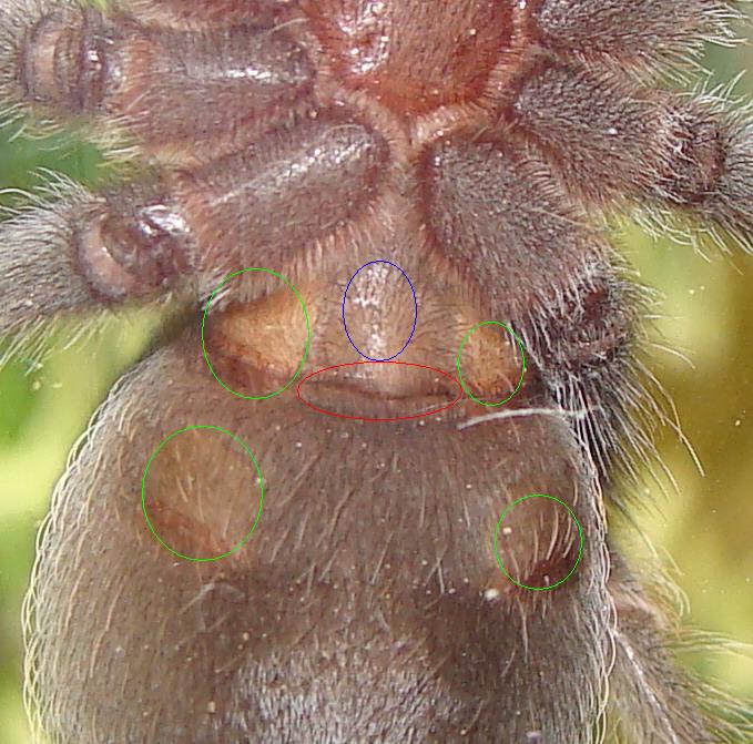 Zuerst suche ich mir die vorderen Buchlungen (grün markiert)und die hinteren Buchlungen (grün markiert). Dann suche ich zwischen den Vorderen Buchlungen ein ventrales Spinnfeld (blau markiert), ist dieses nicht vorhanden (wie auf dem Foto) und diese Stelle behaart und breit (wie auf dem Foto), dann handelt es sich um ein Weib, ist diese Stelle weniger und ringförmig behaart und enger, handelt es sich um einen Bock, da dann an dieser Stelle die ventralen Spinnwarzen sitzen mit der der Bock sein Spermanetz webt. Darunter befindet sich der Epigastralspalt mit der eventuellen Spermathek (rot markiert). Man erkennt auf dem Foto mit dem Markierungen sehr gut die Wölbung zwischen den vorderen Buchlungen was widerum für ein Weib spricht da bei Böcken diese Wölbung flacher ausfällt. Darunter befindet sich die Spermathek. Folglich handelt es sich bei dieser Spinne um ein Weib.
