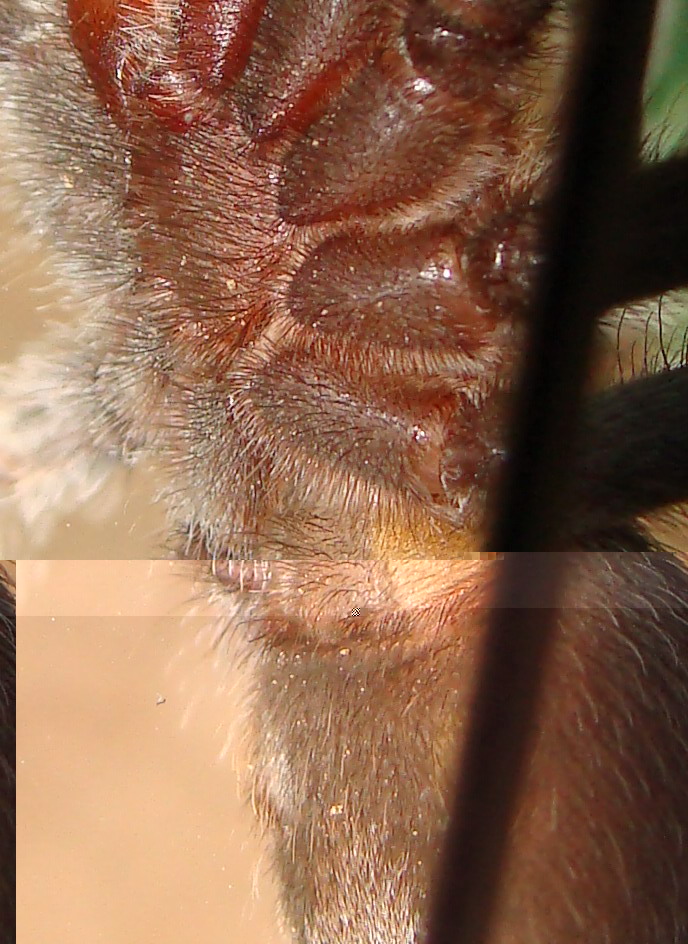Ich konnte heute nochmal gute Fotos machen von der ventralen seitlichen Ansicht. War nicht ganz einfach die Fotos zu schießen. Aber nun sieht man auch die Wölbung besser, was ein Weib bestätigt. Ich hab auch nochmal ne sehr stark vergrößerte Aufnahme gemacht. Ich erkenne dort immer noch kein ventrales Spinnfeld. Ich sag 100%ig ein Weib. Man erkennt unter anderem daß der Bereich breit auseinander geht. Bei einem Bock wäre der Bereich schmal auseinander gehend.