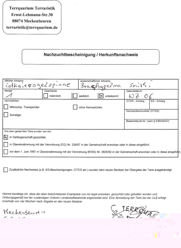 es mag ja sein, dass du Recht hast in dieser Sache, aber ich habe mir, bevor ich mir meine Smithi zugelegt habe, ein Buch speziell über B.Smithis besorgt und darin steht, dass man beim Kauf einen Nachweis bekommt, auf dem "...Anzahl und Art des Tieres sowie Name und Adresse des Verkäufers klar erwähnt werden sollen.". Wenn der Verkäufer der Meinung ist, dass man diese nicht benötige, solle man darauf bestehen.