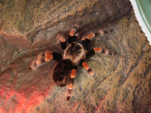 Ich arbeite in einem Zoofachgeschäft und hab mich in Morla gleich verliebt (Vorher hatte ich eine riesen Panik vor den Spinnen) als sie kam, hatte sie schon ein sehr schlankes Po. Wir haben sie natürlich gefüttert und sie hat einmal eine Heuschrecke gefressen. Seit dem hat sie aber nichts mehr gefressen. Wenn ich eine Schrecke reinmache rennt sie vor dem Viech davon.