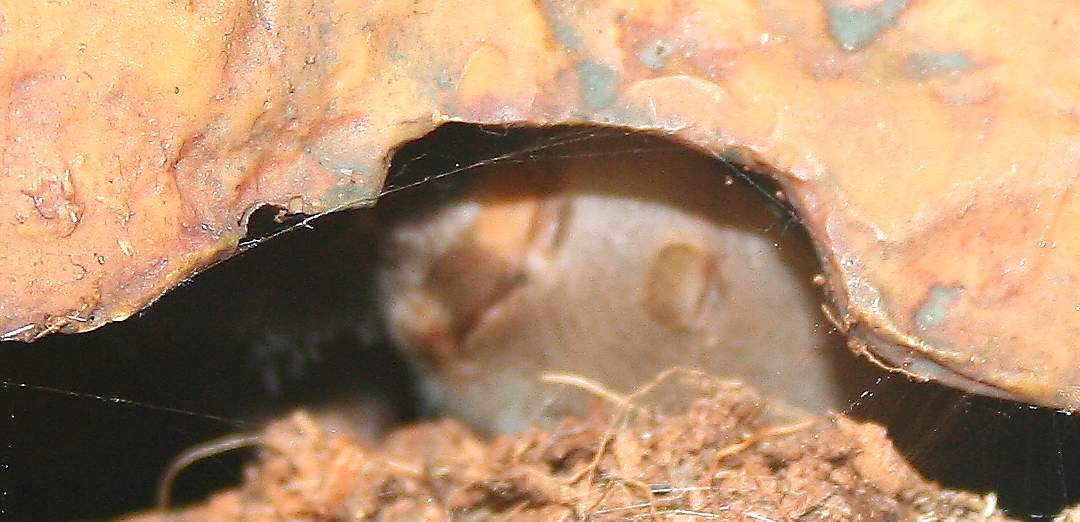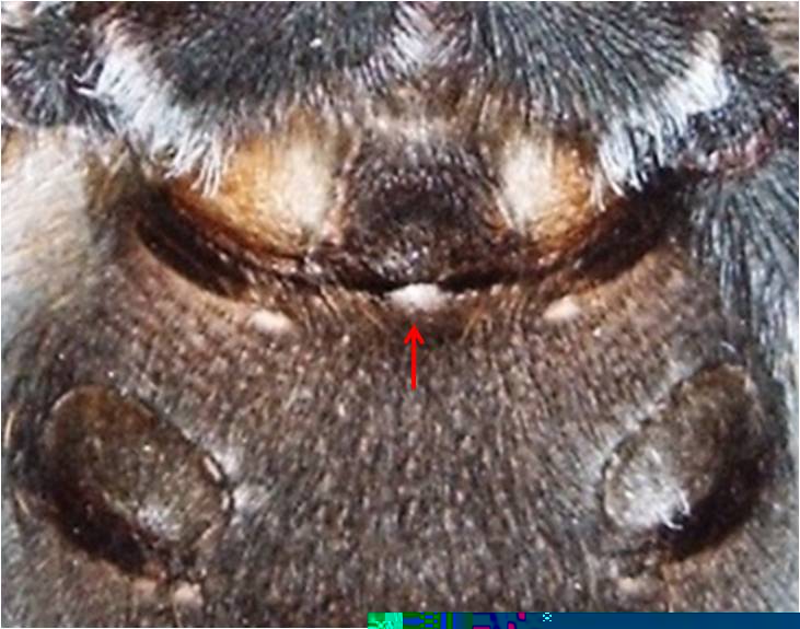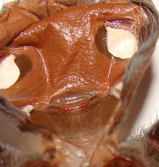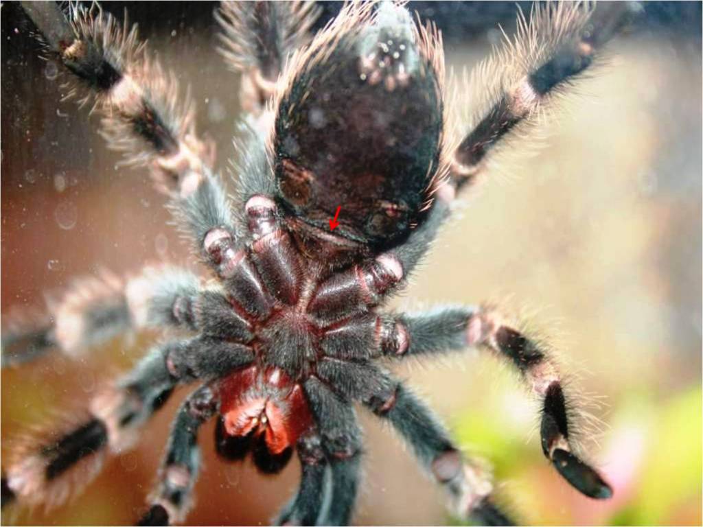 Wenn du die Rückseite deiner Spinne zwischen den Buchlungen mit einer Taschenlampe anstrahlst und sich dann dort ein weißer Punkt abzeichnet, ist das ein eindeutiger Hinweis auf ein männliches Exemplar. In diesem Bereich befinden sich spezielle Spinnendrüsen die bei dem Bau des Spermanetzes zum Einsatz kommen und bei der Lichtreflektion als weißen Punkt erscheinen. Dies ist auch der Grund dafür, wenn man manchmal auf Börsen beobachten kann, dass die Vogelspinne in der transparenten Heimchenbox von unten angestrahlt wird.