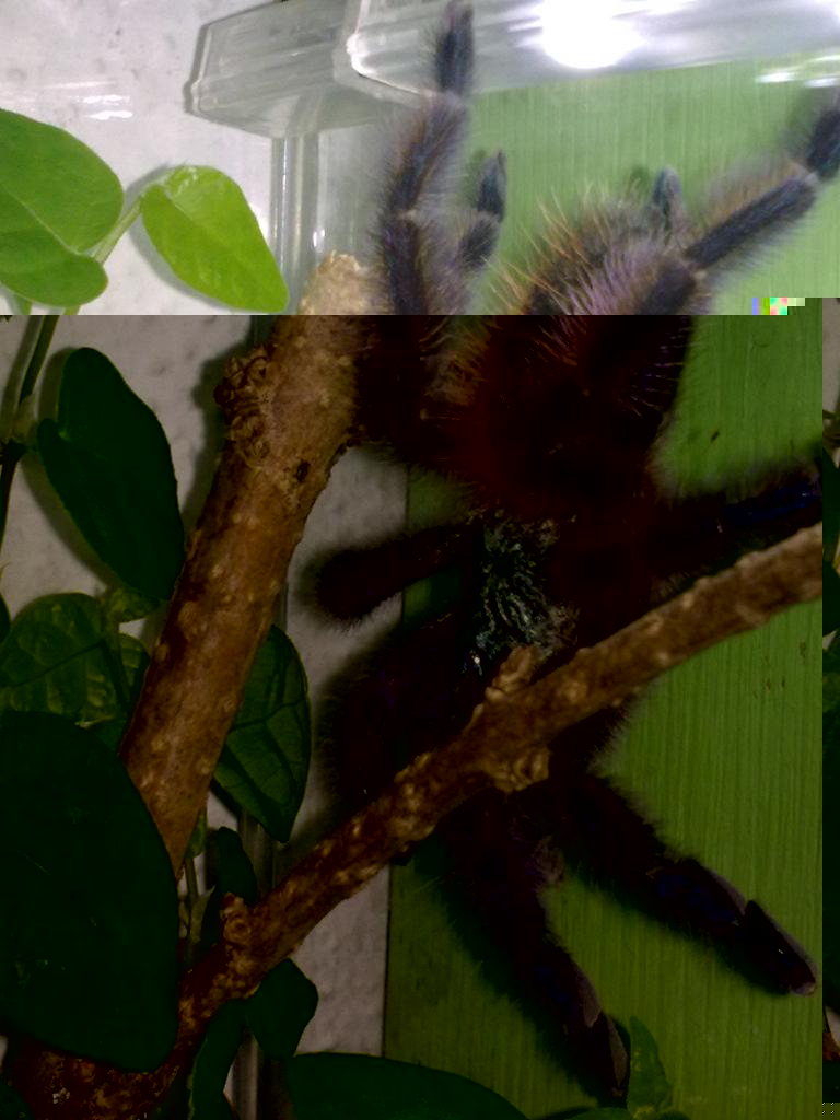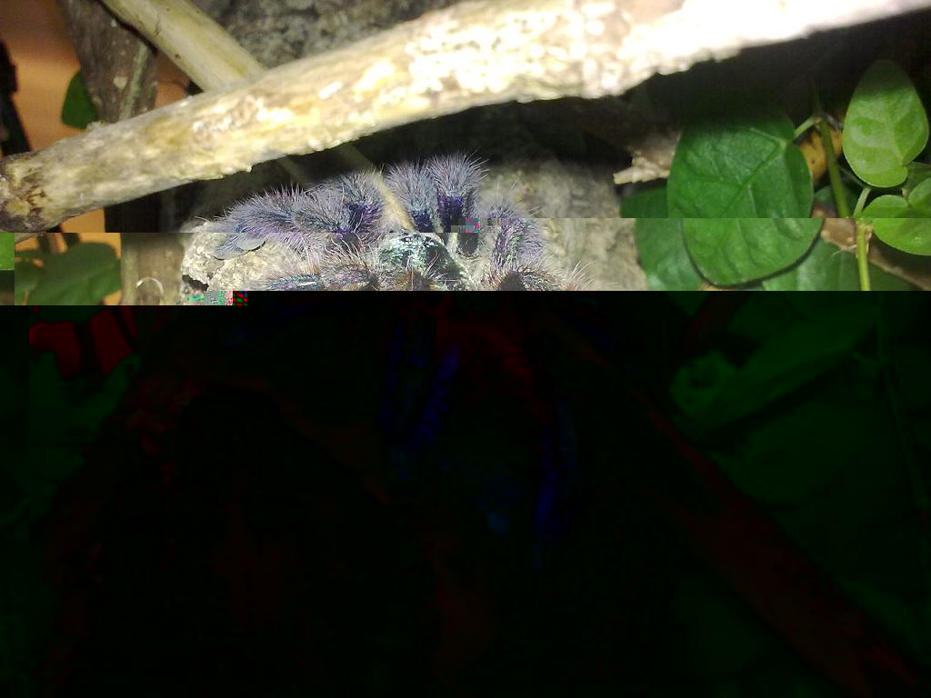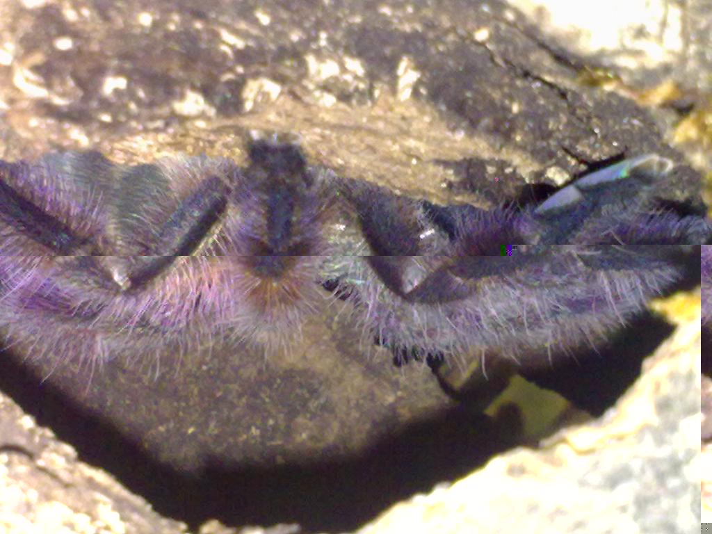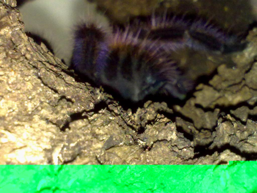 Heute ist meine Avicularia Vericolor von Marbach bei mir eingetrudelt. Sie hat ca. 4 cm KL und ist dabei, sich laaaaaaaaaaaaaangsam umzufärben. DerCarapax glänzt schon richtig wie bei den "großen" und an den Beinchen schimmern schon ein paar rötliche Härchen. Ansonsten hat sie noch ihr blaues "Babyfell" und die Juvenilenzichnung auf dem Po. Hat auch nach wenigen Minuten gleich die Korkröhreninnenseite entdeckt und dort sitzt sie nun.