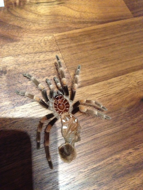 was azrael schreibt ist richtig. - viele neulinge wissen nicht das der chitinpanzer nach einer häutung noch tagelang weich ist. deine spinne wächst auch nun in diesem zeitraum. deshalb empfiehlt sich sich das tier ca. 10 - 14 tage so weit wie möglich in ruhe zu lassen. außer bei leerer wasserschale, in einem günstigen moment in dem man das tier gerade nicht stört, wasser aufzufüllen bzw. überlaufen zu lassen. sonst macht man möglichst gar nix. - bei fluchtreaktionen der spinne könnten sonst verformungen insbesondere der beine die folge sein. ganz wichtig, im falle das du es noch nicht weißt, zwei wochen kein futter anbieten!!! auch die Chelizeren sind noch nicht ausgehärtet!