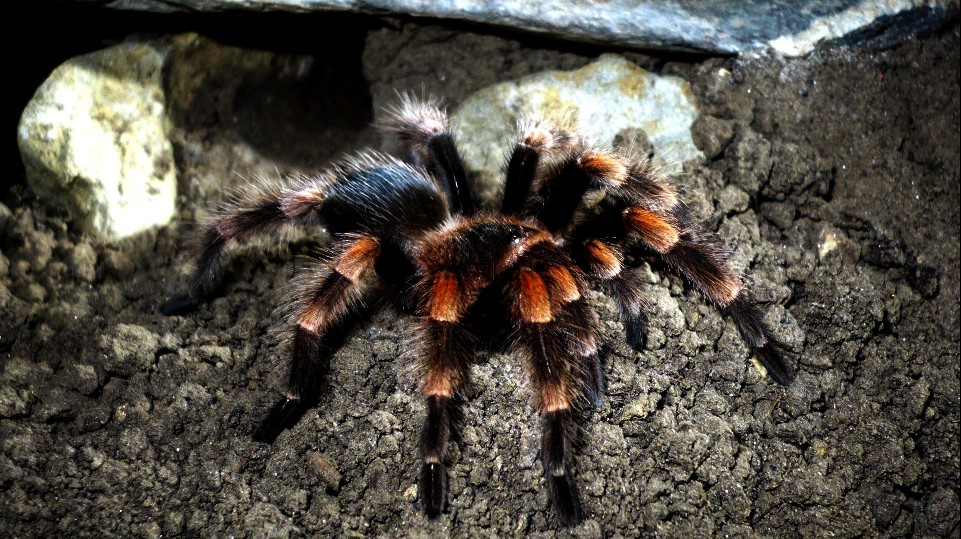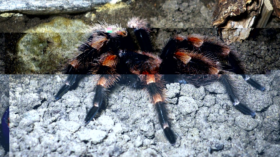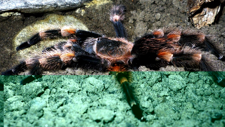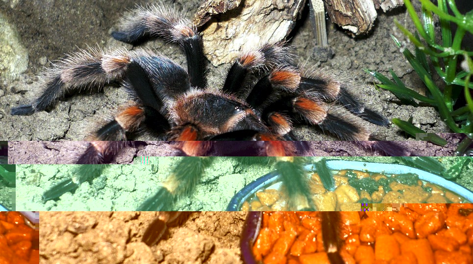 Frau Schmitt lässt so langsam erkennen, warum sie auch "Rotknie-Vogelspinne" genannt wird, und auch Madame Versicolor macht ihrem Namen Ehre, da die Farbe der Behaarung (besonders am Poppes) so langsam ins Rosa wechselt: