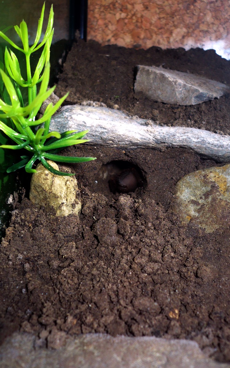 Frei nach Striffler hab ich ja nur ein kleines Mauseloch "vorgebohrt", und ich hatte bislang auch das Gefühl, dass der Bereich unmittelbar vor dem Eingang als einziger Punkt des Terrariums regelrecht gemieden wurde. Und dieser Instinkt macht vielleicht sogar Sinn, denn in der freien Natur sind fertige Höhlen ja sehr begehrt und daher oft schon "bewohnt"...