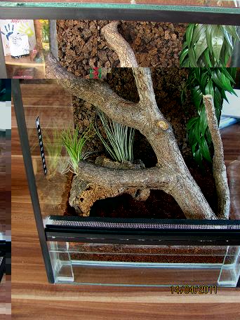 Okay, dann werd ich montag gleich noch einmal ins Exotencenter düsen und noch bissel Erde besorgen. Und eine Höhle aus Kork ist da schon drin, sieht man schlecht auf dem Foto...
