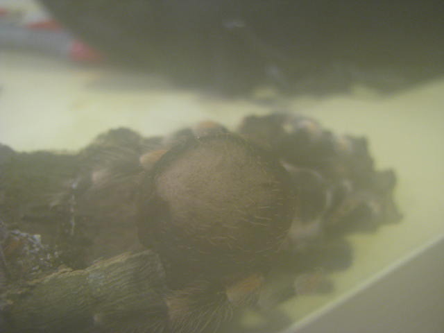 Meine Dame ist nun ca. 2 Jahre alt und ich hab sie vor gut nem Monat bekomm. Die Temp. sind tagsüber 26 Grad im Terri und unterm Spot ca. 30, nachts ca. 19 Grad. Luftfeuchte tagsüber 50-60 % nahts um die 70 bis 80%.- der Boden ist momentan noch ein bischen zu feucht. Ich kann beobachten wie sie in ihrem Korkröhrenversteck so ziehmlich unter dem Spot sitzt. Mein Problem sie hat bis Dato nicht gefressen. Ihr Abdomen ist ziehmlich prall und sie hat diesen braunen Fleck am A...... siehe Bild *g*