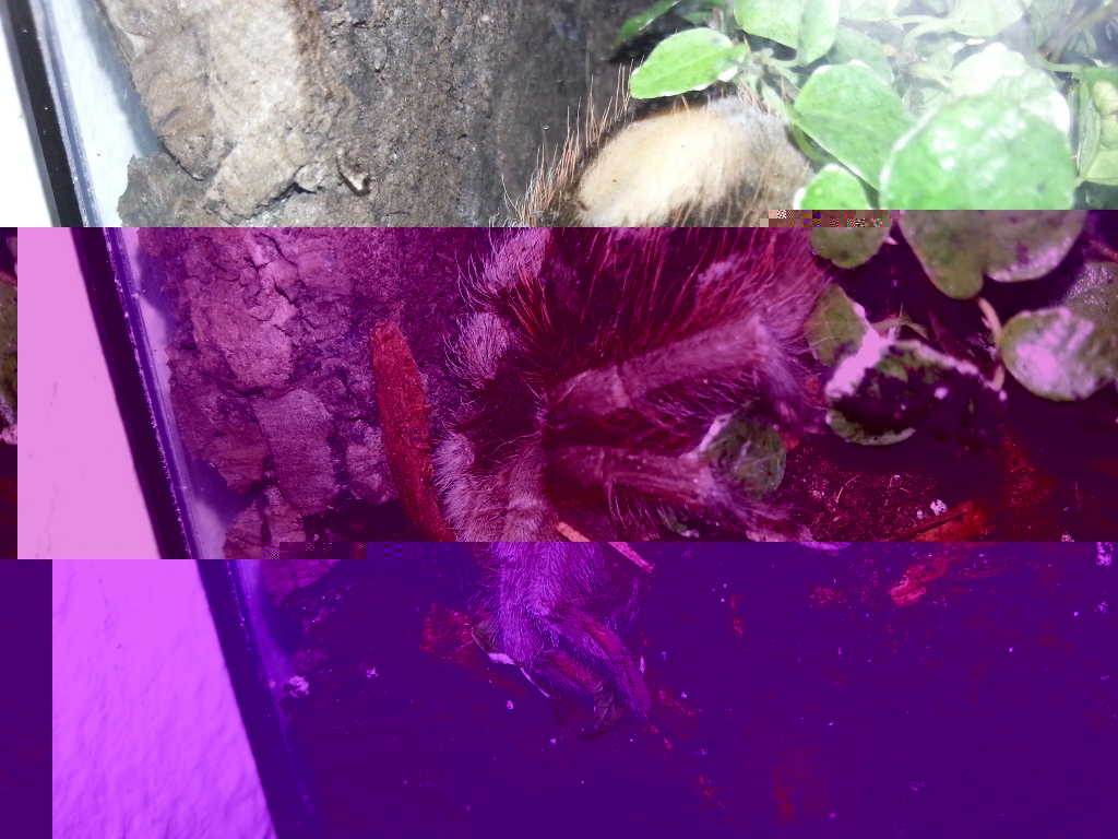 Ich hab die Spinne noch mal genau durch die offene Terrarientür betrachtet und es sieht so aus als wenn sie schon kurze dunkle Haare auf dem Hintern hat, darauf so orangerote Haare, sieht aber alles sehr abgescheuert und ausgeblichen aus...