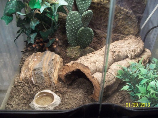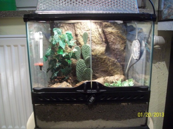 Die Temperatur ist vielleicht etwas hoch (wird bei mir höchstens im Sommer erreicht), aber ansonsten sieht das alles gut aus (ich gehe mal davon aus der Kaktus ist nicht echt). Wenn sie sich nicht gerade erst gehäutet hat, dann kannst du auch füttern, quasi als Begrüßungsgeschenk. Dann weiß sie schonmal, dass sie in der neuen Umgebung nicht verhungert...