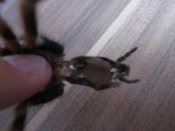 Spermathek konnte ich bis jetzt keine erkennen, da ist innen einfach nur alles flach und gleich wie bei einem Tischtuch. Als sie vor der Häutung noch ab und zu an der Scheibe saß, deuteten die äußeren Merkmale eher auf ein Männchen hin.