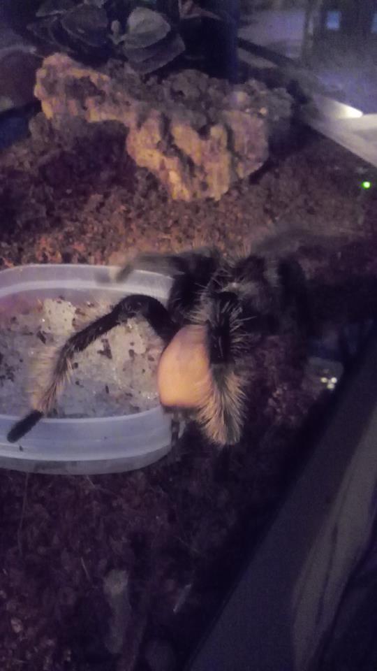 Wenn eine Häutung bevor steht,"werfen"grad die Brachypelmaarten"ihre Brennhaare ab und das Abdomen wird dunkel bzw.schwarz.Ist die neue Haut,die durchschimmert.