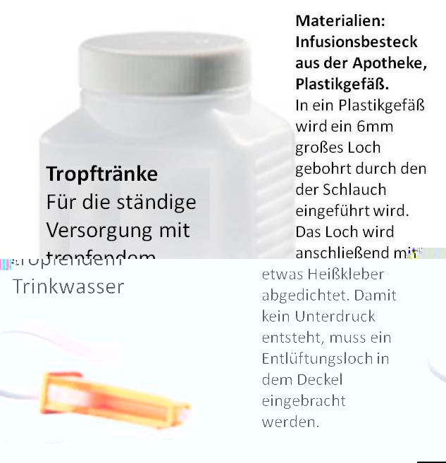 Die Tropftränke ist für ca. 6€ im Handel zu erwerben (einfach den Begriff "Tropftränke" googeln). Der Schlauch wird dann ins Terrarium zur Trinkschale geführt. Die Kosten für den Eigenbau belaufen sich auf ca. 1€