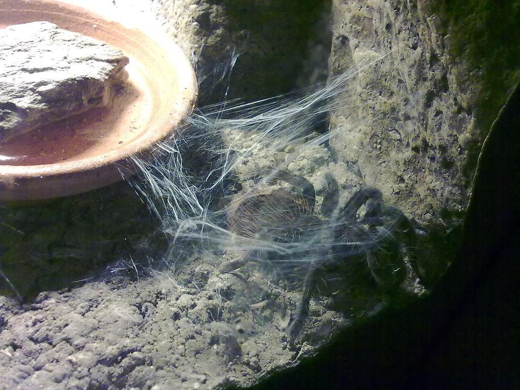 sieht man da auch kaum was. Ab und zu bastelt sie mal einen Fressteppich, aber nur bei größeren Brummern. Der ist nach einiger Zeit dann aber auch wieder verschwunden. Ansonsten ertappe ich sie manchmal, wie sie mit den Spinnwarzen über den Boden "wedelt", die dünnen Fäden sieht man aber kaum, manchmal nur im Licht einer Taschenlampe. Sind wohl eher "Führungsfäden" die als Ortungssystem quer durchs Terrarium gehen. Yoar, und ihren Höhleneingang hat sie auch zusätzlich zur Erde mit ein paar Fäden und Brennhaaren "gesichert", was drinnen abgeht sehe ich ja nicht.